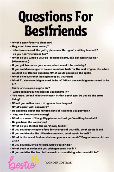 When it comes to friendships, there’s no one we cherish more than our best friend. They’re the ones who know us inside and out, who have seen us at our best and worst, and who love us unconditionally. But how well do you really know your best friend? Sure, you know their favorite color and their biggest pet peeve, but there’s so much more to them than that. To truly get to know your best friend, you need to ask them the questions that will help you understand their hopes, their dreams, and their fears. $title$