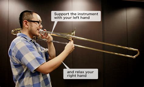 - Hold the trombone firmly but not too tightly, using a light grip with your left hand and supporting the weight with your right.
