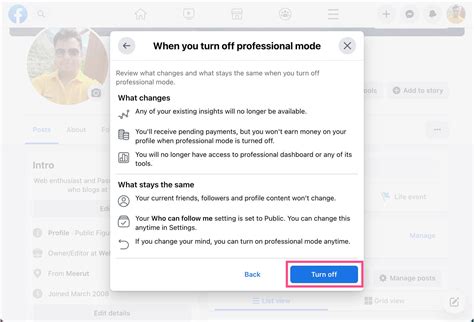 you have switched off professional mode in Facebook, you will be prompted with a confirmation message. Click “Turn Off” to complete the deactivation process.